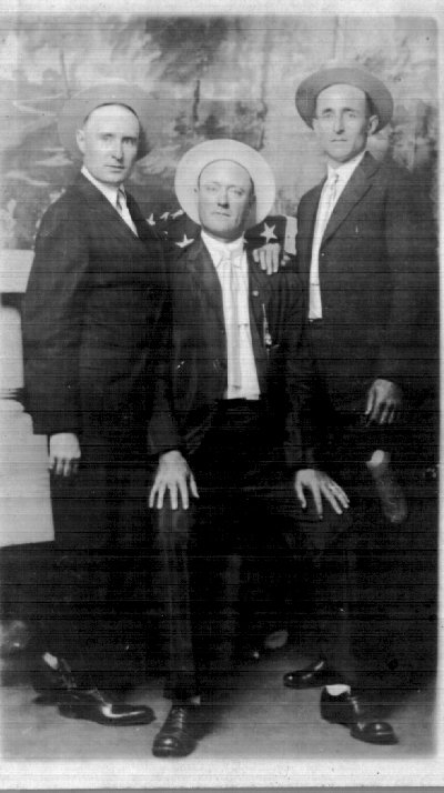 Thank you to Jan Daily for submitting her family unknown's. She calls them "3 "Follically Challenged" Men! They were in her collections of Vass family members but not marked. She doesn't know the significance of the flag behind them (furled and therefore hard to recognize where it is a Stars & Bars all rolled up or a Stars & Stripes. They would seem to be dressed a little biit too moden for Stars and Bars. They look enough alike to be brothers. |