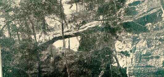NATURAL BRIDGEIn the extreme northern part of the county is a natural bridge, also described by Collins. It is a great rock spanning a dry ravine through which a stream sometimes flows. It, too, was somewhat exaggerated. The bridge is about twenty or twenty-five feet long, but is not wide enough for a roadway. It is still concealed in a forest not far from a road through the hills.