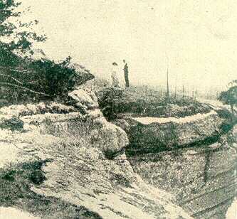 Near the city of Hopkinsville are two caves important enough to have been explored. One a mile to the east is known as Fleming’s Cave. Its entrance is a deep sinkhole and it can be penetrated for hundreds of yards. The other known as Campbell’s Cave is about the same distance northeast of the city. Its entrance is on a steep hillside under a great shelving rock, making a chamber fifty feet deep and one hundred feet wide, from which two passages branch in opposite directions that have been explored for considerable distances. It is the belief that there is an underground passage between these caves, too small for explorers to enter. Both of them have been used for pleasure resorts, as springs of cool water are near them. Dances were often held in Campbell’s Cave and in a pavilion near Fleming’s Cave.