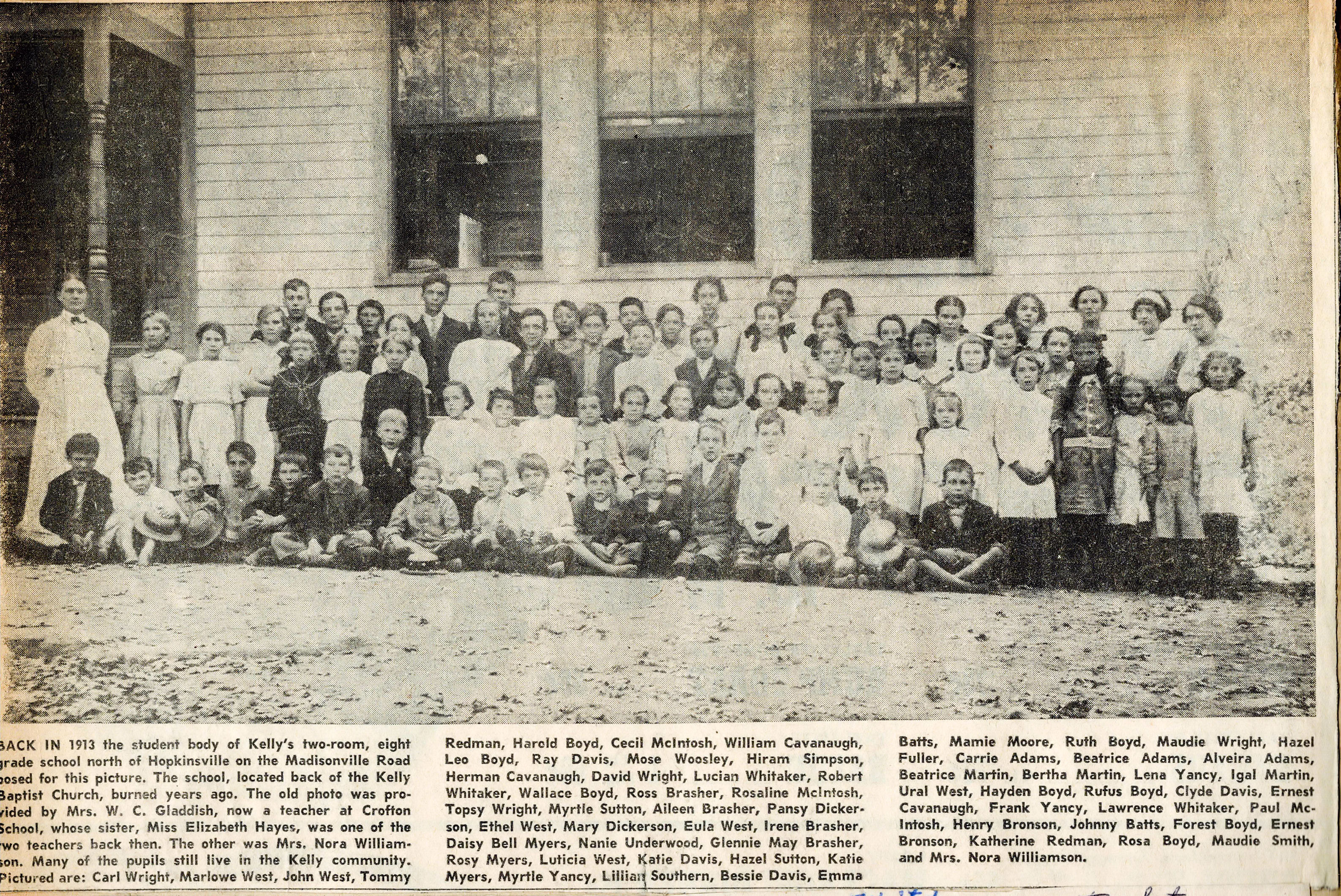 Back in 1913 the student body of Kelly's two room,eight grade school, north of Hopkinsville, on the Madisonville Road posed for this picture. The school, located back of the Kelly Baptist Church, burned years ago. the old photo was provided by Mrs. W. C. Gladdish, now a teacher at Crofton School, whose sister, Miss Elizabeth Hayes, was one of the two teachers back then. The other was Mrs. Nora Williamson.